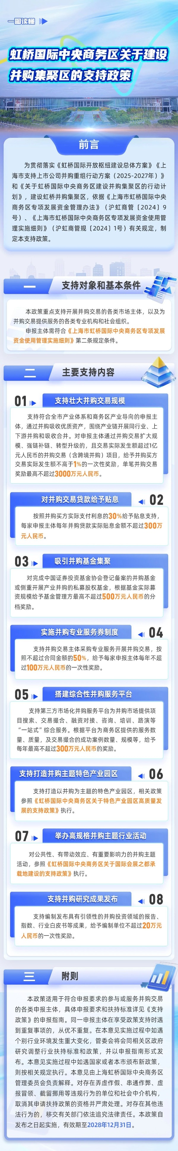虹桥国际中央商务区管委会介绍,《虹桥国际中央商务区关于建设并购集聚区的支持政策》(点击可查看政策全文)近日印发,主要包括支持壮大并购交易规模、对并购交易贷款给予贴息、吸引并购基金集聚、实施并购专业券制度、搭建综合性并购服务平台、支持打造并购主题特色产业园区、举办高规格并购主题行业活动、支持并购研究成果发布等,详见↓