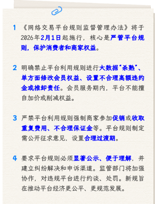 市市场监管局介绍,市场监管总局和国家网信办近日联合发布《网络交易平台规则监督管理办法》(以下简称《办法》,点击查看原文),旨在规范网络交易平台规则(以下简称平台规则)制定、修改和执行,维护网络交易秩序,保护网络交易各方主体合法权益。《办法》自2026年2月1日起施行。详见图解↓