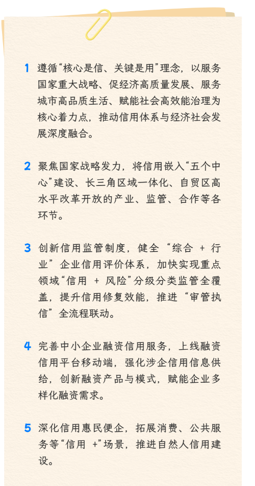 《2026年上海市社会信用体系建设工作要点》(点击可查看原文)近日印发,提出六方面共18项工作任务,包括积极发挥信用功能服务“五个中心”建设、健全“综合+行业”信用评价体系、创新融资信用产品、完善信用修复机制等,一图读懂↓